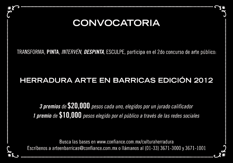 La empresa BROWN-FORMAN TEQUILA, S. DE R.L. DE C.V. conocida comercialmente como CASA HERRADURA convoca a participar en el 2do concurso de arte público: HERRADURA ARTE EN BARRICAS EDICIÓN 2012, que tiene como objetivo difundir y promover la cultura y de la misma manera enaltecer la herencia cultural del tequila como estandarte mexicano en el mundo, así como, apoyar al talento artístico en México.